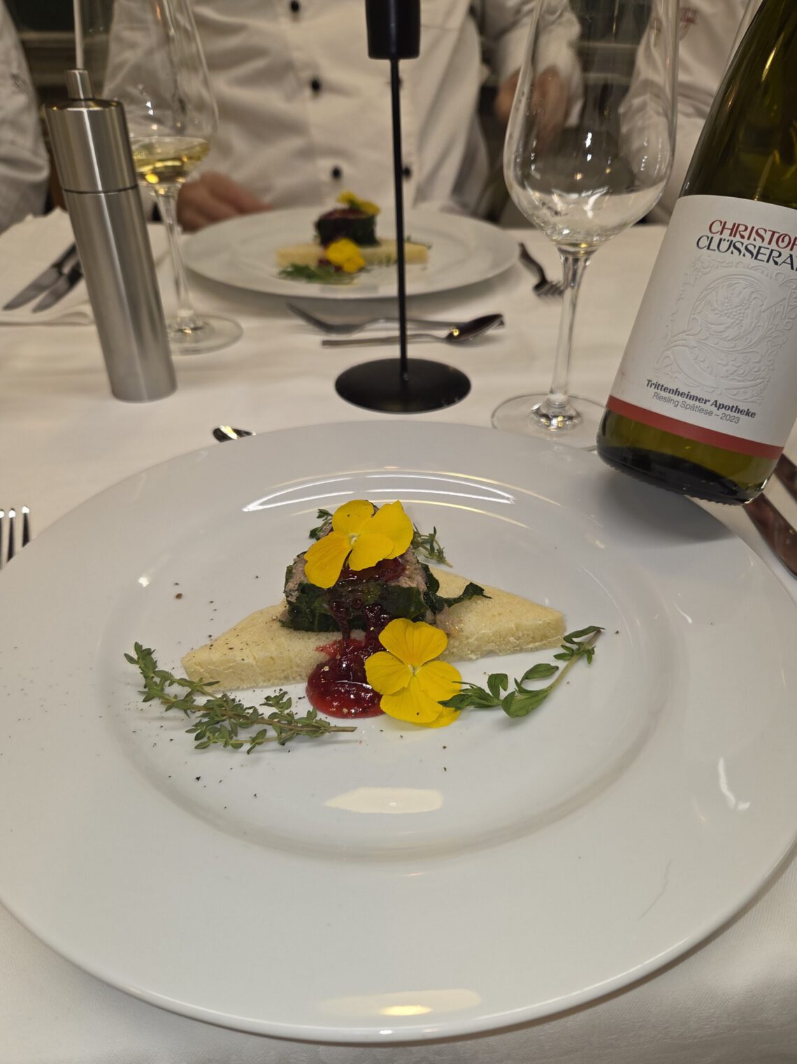 Terrine von der Gans mit Foie gras & Kastanie im Spinatmantel