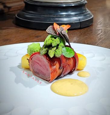 Grüner Spargel auf Lammrücken im Schinkenmantel an Sauce Bernaise